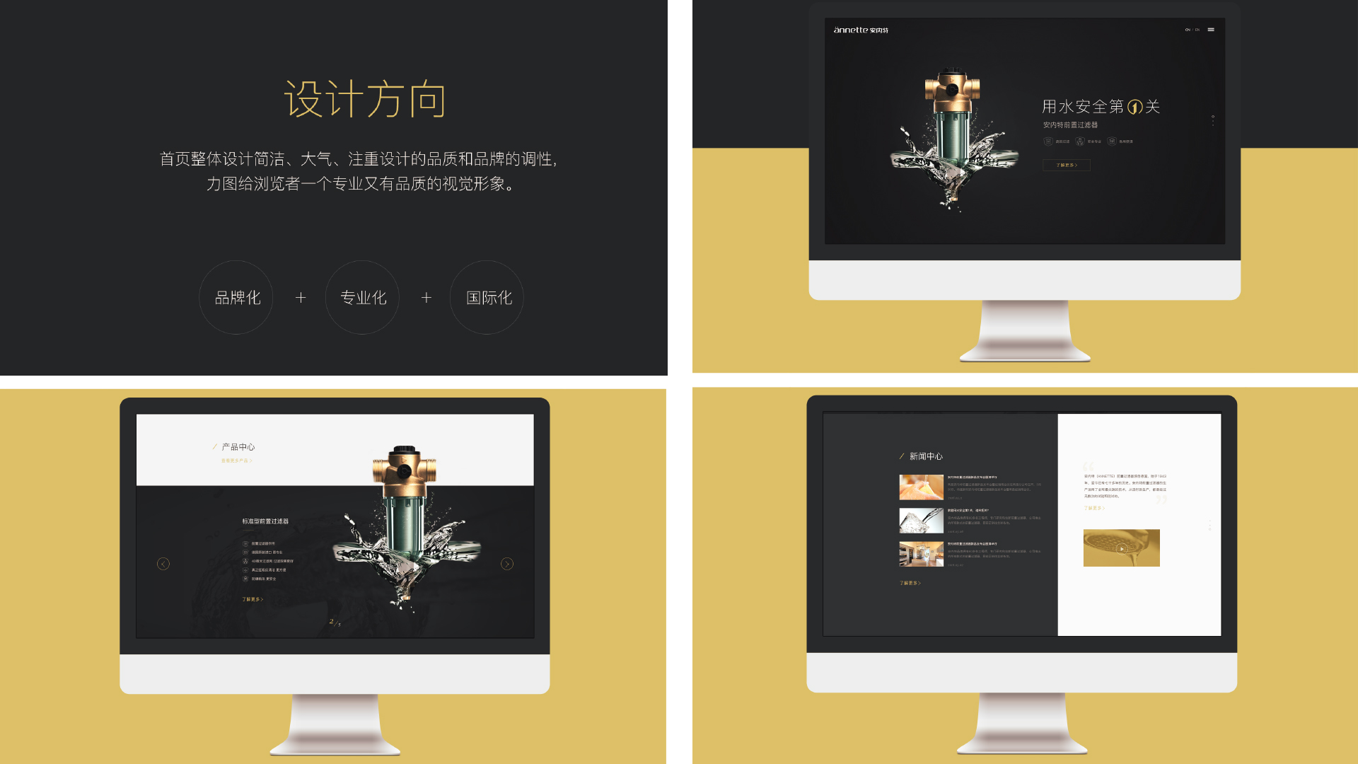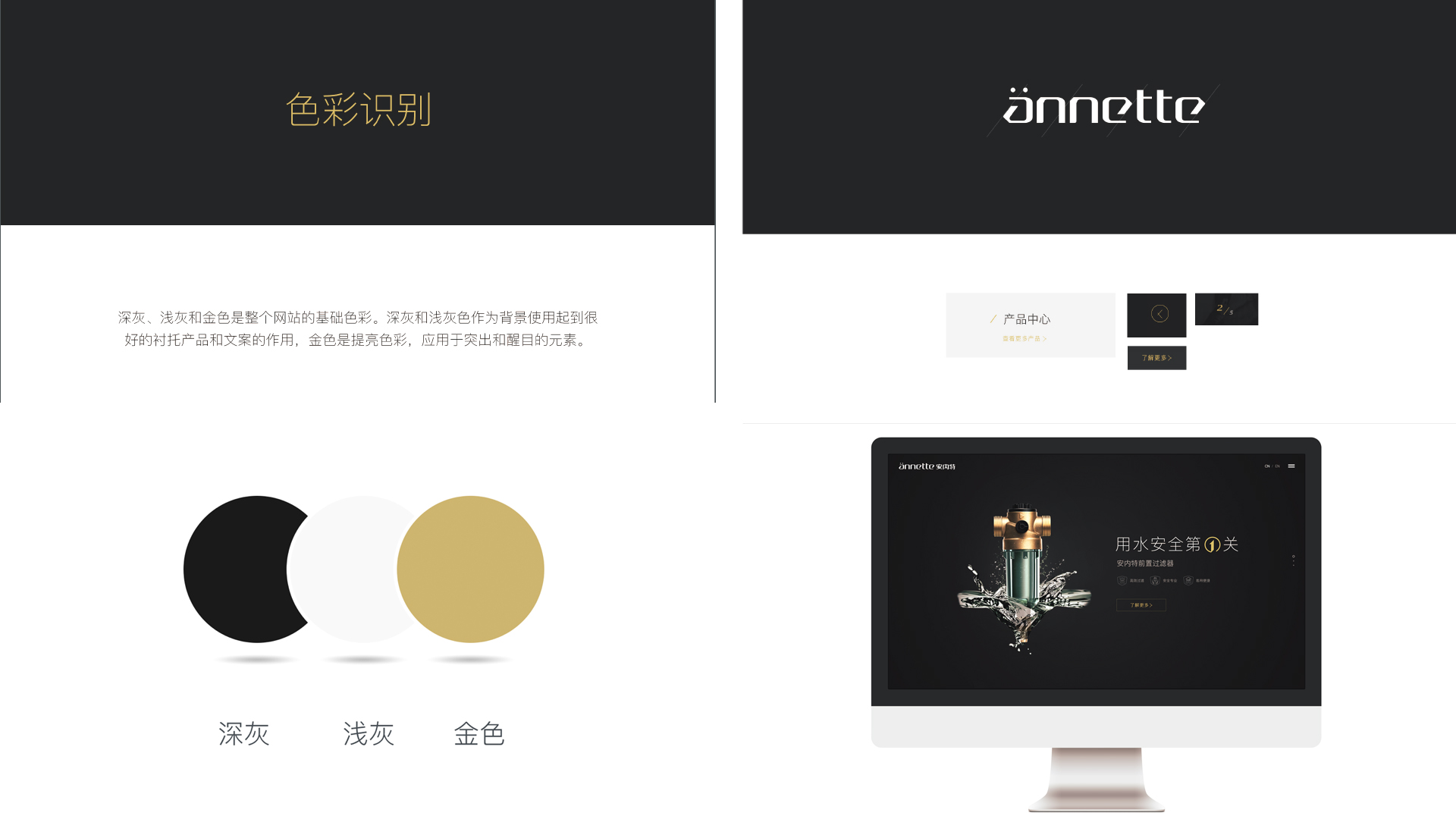 深灰、淺灰和金色是整個網站的基礎色彩。深灰和淺灰色作為背景使用起到很好的襯托產品和文案的作用,金色是提亮色彩,應用于突出和醒目的元素。首頁整體設計簡潔、大氣、注重設計的品質和品牌的調性力圖給瀏覽者一個專業又有品質的視覺形象。